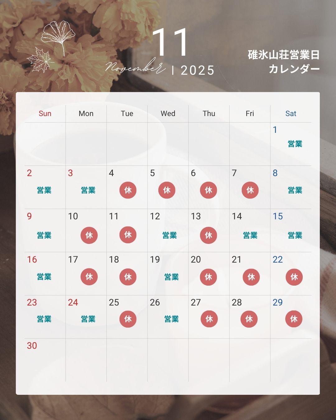 11月の碓氷山荘営業カレンダーです。